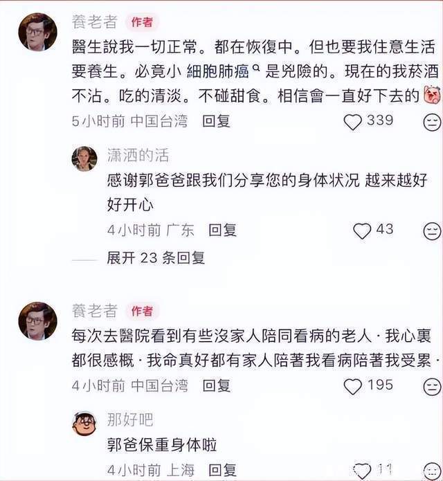 “医生说我一切正常,都在恢复中,但也要注意生活要养生,毕竟小细胞肺癌是凶险的。”11月21日,郭碧婷父亲在社交媒体上更新近况,平静叙述中透着一股与病魔周旋的坚韧。如今他烟酒不沾、饮食清淡、远离甜食,将医嘱化作日常守则。而真正让他发出“我命真好”感慨的,是每一次就医时女儿郭碧婷的陪伴,那句“一切都会好起来的”,不仅是父亲的信念,更是父女携手对抗病魔的缩影。